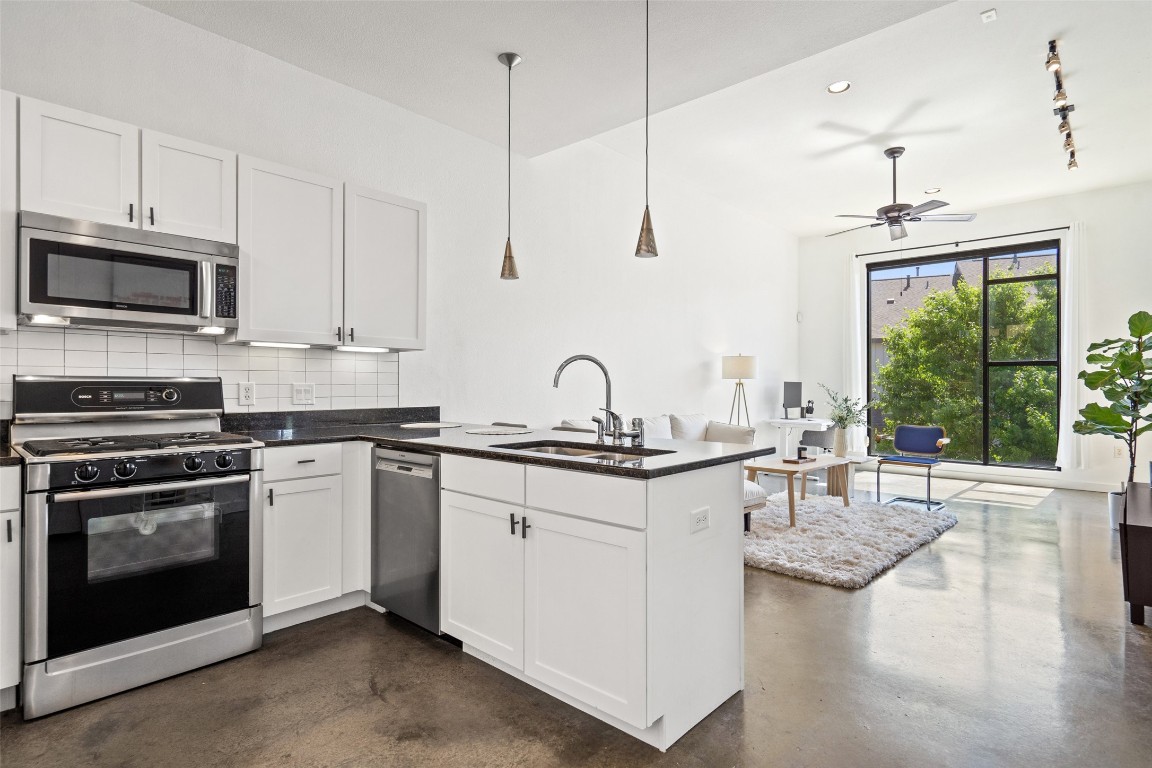 Looking for the ultimate Austin living experience? Look no further than this modern 1 bedroom, 1 bathroom corner unit that is the epitome of urban living! This stunning top floor loft is situated in a white-hot location off South Lamar and boasts an impressive list of features that are sure to impress even the most discerning buyers. Step into this chic, sophisticated space and you will immediately be struck by its contemporary design. With an open concept floor plan, 11 foot high ceilings, concrete floors, and oversized windows that supply plenty of natural light, the space is perfect for those who love to entertain or simply enjoy a comfortable and inviting home. The kitchen is a chef's dream, with Bosch appliances, gas cooktop, plenty of storage space, and a breakfast bar for casual dining. The living room is the perfect place to relax and unwind or take in some fresh air on the private balcony. Thoughtful layout has additional room for an office nook in the living area. The prime position of the unit within the complex creates a neighborless feel that provides peaceful solitude from the bustle of city life. The bedroom is a haven of tranquility, with multiple windows, ample closet space, and an en-suite bathroom that is the epitome of luxury. With stylish black tile, and premium fixtures and fittings, you will feel like you are in your own private spa every time you step into this space. Mere minutes from downtown, 9 miles from the airport, and walking distance from South Lamar’s best dining, shopping, and entertainment options. Additional offerings from the association include a resident dog park, 1 dedicated parking space, all exterior maintenance, trash, sewer, water, and exterior insurance. So why wait? Come and experience the ultimate in what Austin has to offer and make this incredible condo your own!