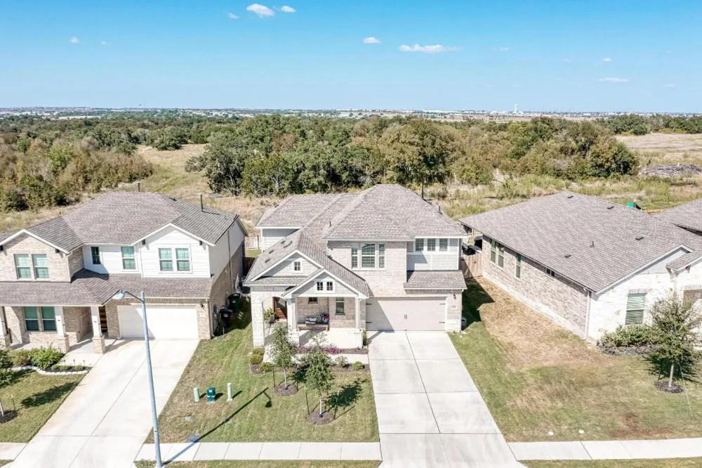 Welcome home to this beautifully updated 2-story gem in the acclaimed Star Ranch community! Offering 2,327 sq ft, this 4-bedroom, 2.5-bath home features a thoughtfully designed layout with the primary suite on the main level and a spacious game room upstairs—perfect for entertaining or relaxing. Inside, you’ll love the modern updates throughout, including wood-look tile flooring, gray cabinetry, white quartz countertops, and stainless steel appliances. The open kitchen boasts a breakfast bar that flows seamlessly into the living area, highlighted by a cozy fireplace—ideal for everyday living and hosting guests. The private primary retreat includes a luxurious en suite bath with a frameless walk-in shower, separate soaking tub, double vanity, separate water closet, and a large walk-in closet. Upstairs bedrooms are generously sized, offering flexibility for family, guests, or home office needs. Step outside to a spacious backyard with a large covered patio, overlooking non-developed property—providing privacy and peaceful views. Unbeatable location with quick access to everything you need: just 2 minutes to HEB, 10 minutes to Stone Hill Town Center, 15 minutes to the new Samsung, and only 2 minutes to the 130 Toll Road for fast commutes to Austin, the airport, and major tech employers. This home checks all the boxes—style, space, privacy, and an unbeatable location. Don’t miss it!