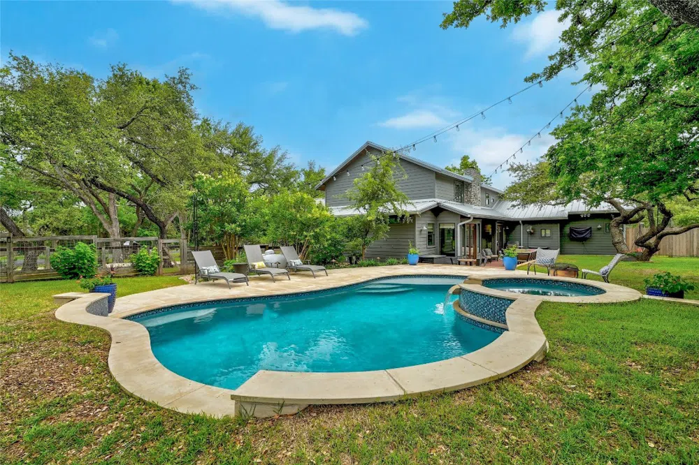 Welcome to 8539 Thunderbird Road in Austin, Texas! This stunning property on a near acre in West Oaks offers all the privacy and flexibility of country living yet within 15 minutes of downtown Austin in the city’s ETJ. LOW TAXES, and reduced restrictions and regulations not found within the City. Minutes to the Waldorf School and Regents School of Austin, this home was taken down to the studs in 2015 with the main house offering 4,407 sf of conditioned space + an attached oversized 2 car garage w/workspace and ample room to add additional living space on the second floor. The main living/dining area offers a spacious open floor plan with stain-grade cabinetry, a wood burning fireplace, and a coffee/cocktail bar with an ice maker, sink, and beverage fridge. The gourmet kitchen offers stainless GE Monogram built-in appliances and a Butler’s pantry. The first-floor primary suite with a double vanity and double walk-in closets, opens to the expansive private backyard. The main level of the home offers a dedicated office with a built-in workspace and separate exterior entrance, an oversized mudroom, and a cheery laundry room with built-ins. The second level of the home offers 3 spacious (one en suite) bedrooms each with oversized walk-in closets and a 2nd living area that's adjacent to the creative art/craft room with a built-in workspace and storage. Taking advantage of the natural and peaceful setting, the property offers multiple outdoor entertaining areas: a wood patio off the kitchen/dining areas, a beautiful pool and spa (2019) surrounded by a limestone patio, a built in fire pit sitting area, and a concrete sport court. The detached 1,300 square foot ADU/barn offers open concept living/dining/kitchen, a separate bedroom, a full bathroom with walk-in shower, and a stackable W/D. Ideal for multigenerational living or an office, the ADU has provided consistent income as an STR since 2016. Survey/OSSF available.